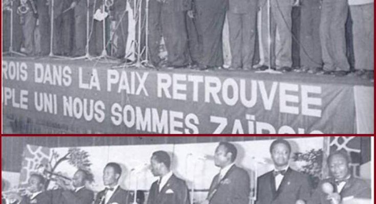 C’était au cours d’une cérémonie grandiose organisée dans la salle du Parti à Mbuji Mayi et baptisée “Soirée de la Zaïroise”. Le Président Mobutu interprétait officiellement, et pour la première fois, le nouvel hymne national qui remplaçait ainsi l’ancien hymne (le “Débout Congolais”). Cette grande soirée culturelle avait été organisée sous le haut patronage du Président de la République et fut un fait unique dans les annales de la culture de la RD Congo. Devant les corps constitués et devant le gratin politique, le Président Mobutu chanta l’hymne, accompagné de tous les grands musiciens du pays qui avaient été cordialement invités à partager le podium avec lui. On pouvait y voir, en avant-plan, Kiamuangana, Bokelo, Madiata, Tabu Ley, Luambo Makiadi, Longomba, etc. Ce fut un événement unique en son genre et un pari gagné pour Mobutu qui avait, à l’issue de la cérémonie, demandé aux personnes présentes de faire la promotion et la vulgarisation du nouvel hymne national.