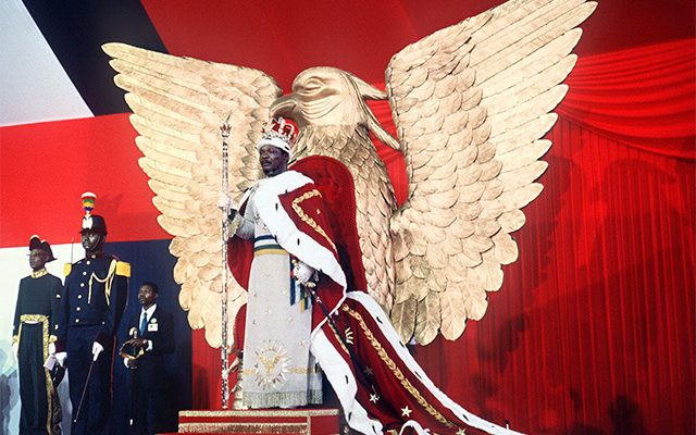 Tout n’était que démesure, à l’image du trône colossal de 3,10 mètres de haut, en forme d’aigle aux ailes déployées, qui pesait deux tonnes. Mais le faste de cette cérémonie était une grande affaire pour l’artisanat français: garde-robe d’apparat, broderies, argenterie, meubles, accessoires, bijoux, trône, carrosses, décors de table…Et même le gâteau impérial étaient venus de Paris. 231 villas avaient été construites pour accueillir les invités et spécialement équipées depuis Paris par Christofle, qui avait tout envoyé : 10.000 pièces (les assiettes en Limoges, les verres en Baccarat, les couverts gravés… jusqu’aux seaux à champagne et aux briquets, et même un service à thé en argent du plus pur style Empire). La “plaisanterie” aurait coûté plus de 7 milliards de francs CFA de l’époque (près de 140 millions de francs français), soit le cinquième du budget annuel de l’Empire. Un empire qui, en 1976, accusait un déficit de près de 2 milliards de francs CFA. Un empire dont les sujets manquaient de tout. Bokassa sera renversé par son neveu, David Dacko, le 20 septembre 1979.
